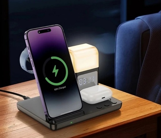 شارژر وایرلس ۵ کاره طرح ماشین قابلیت شارژ گوشی و اپل واچ و ایرپاد همزمان دارای ساعت رومیزی با قابلیت